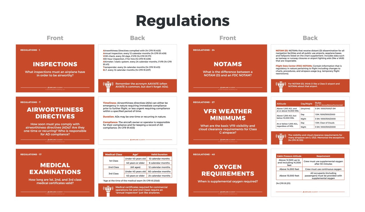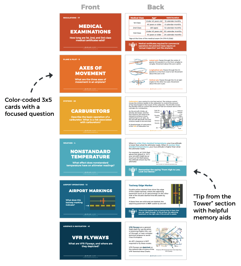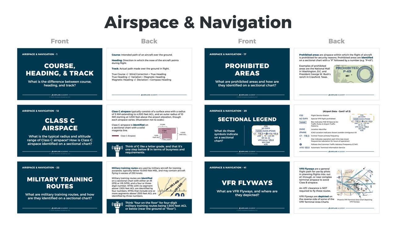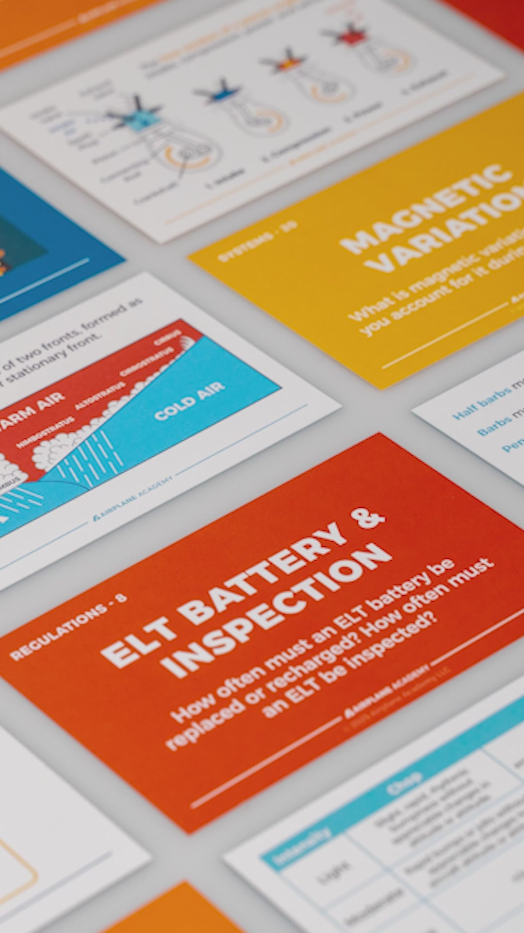 These cards aren’t a replacement for ground school — but they do provide the key ingredient of active recall, which is one of the most effective ways to actually retain information. Ground school videos and books are great for learning concepts, but they’re not designed for repeated review. Most people don’t rewatch hours of video or reread textbooks again and again — and that’s where flashcards shine.